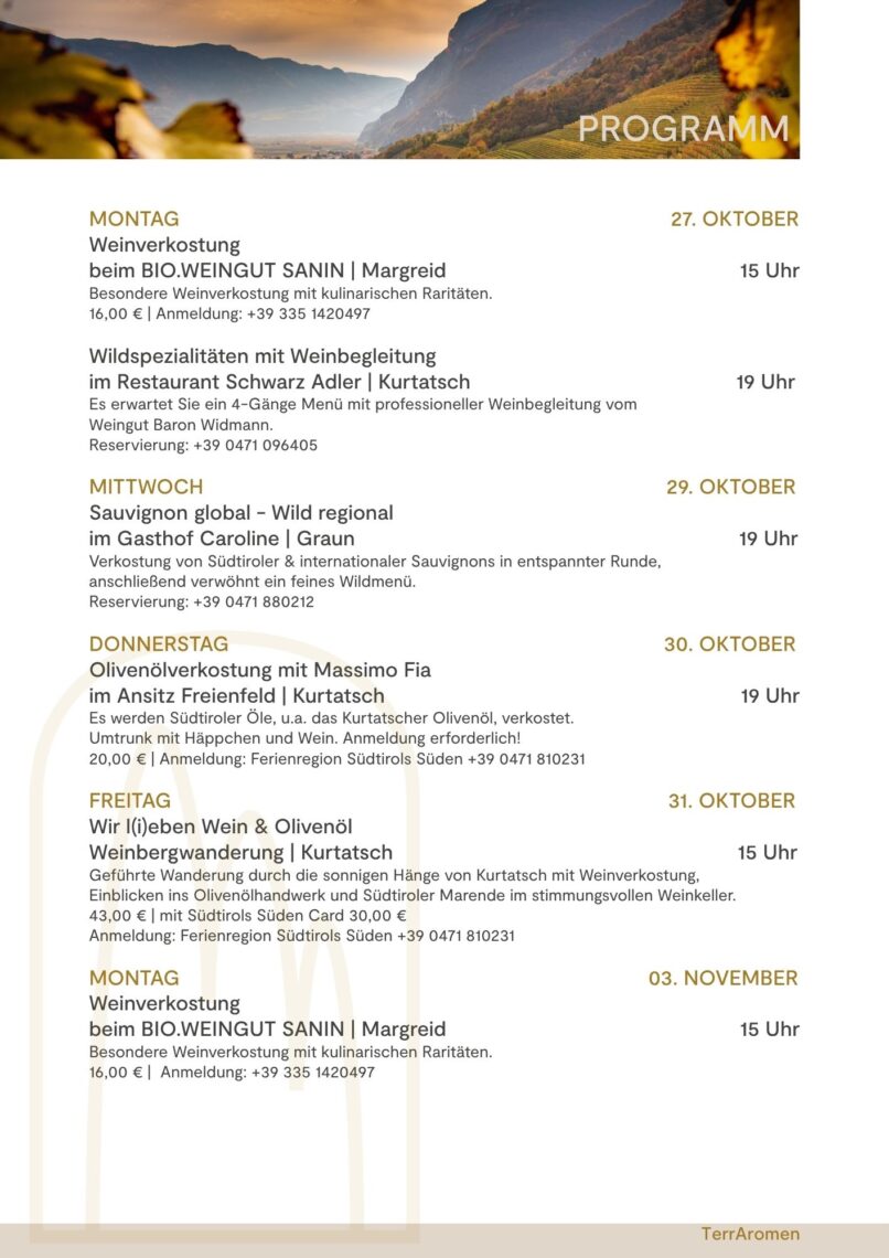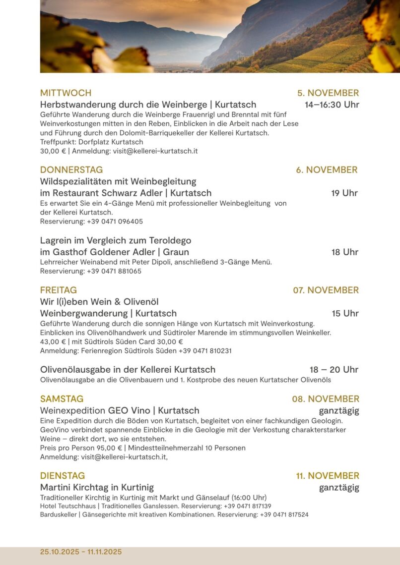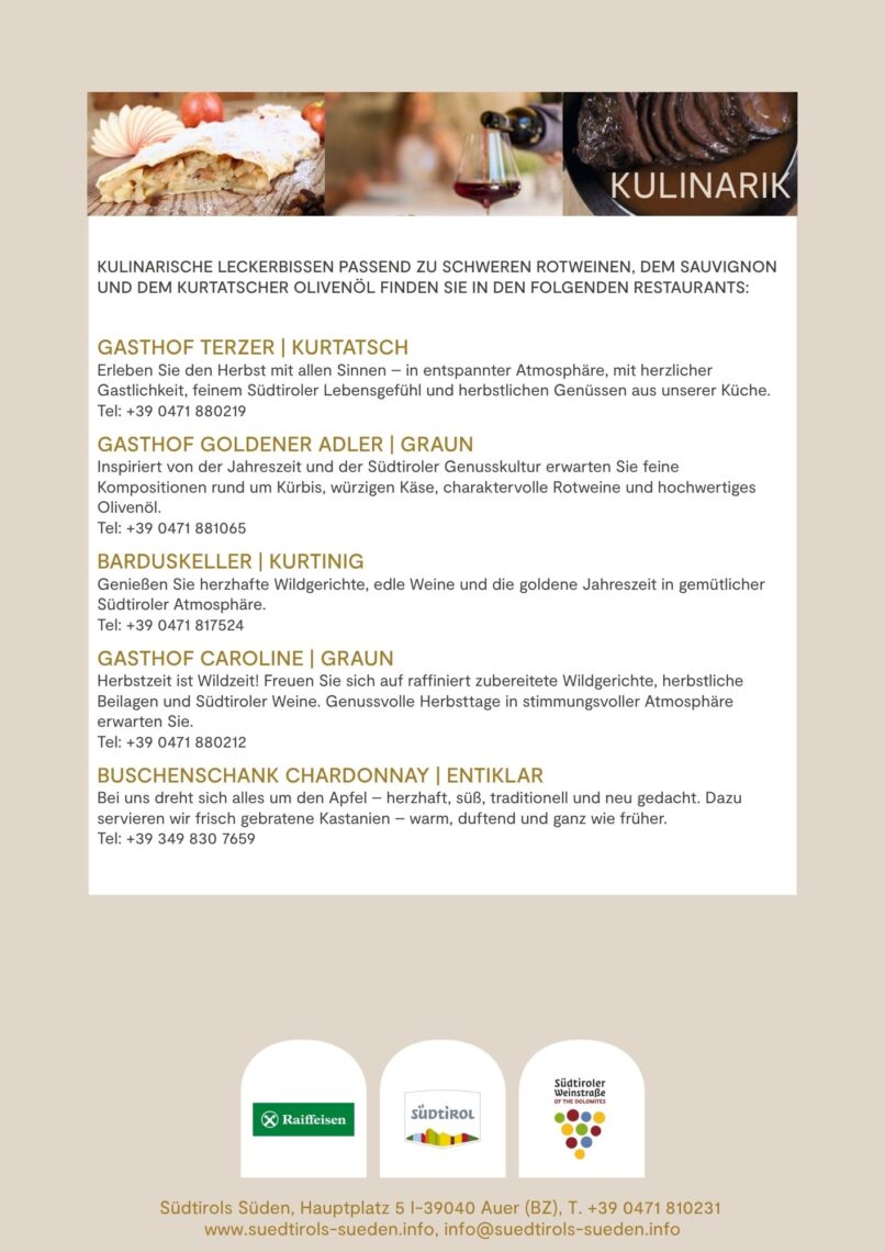 Kulinarische Wochen in denen sich alles um den Rotwein, dem Kurtatscher Olivenöl und die dazu passenden Herbstgerichte dreht.
